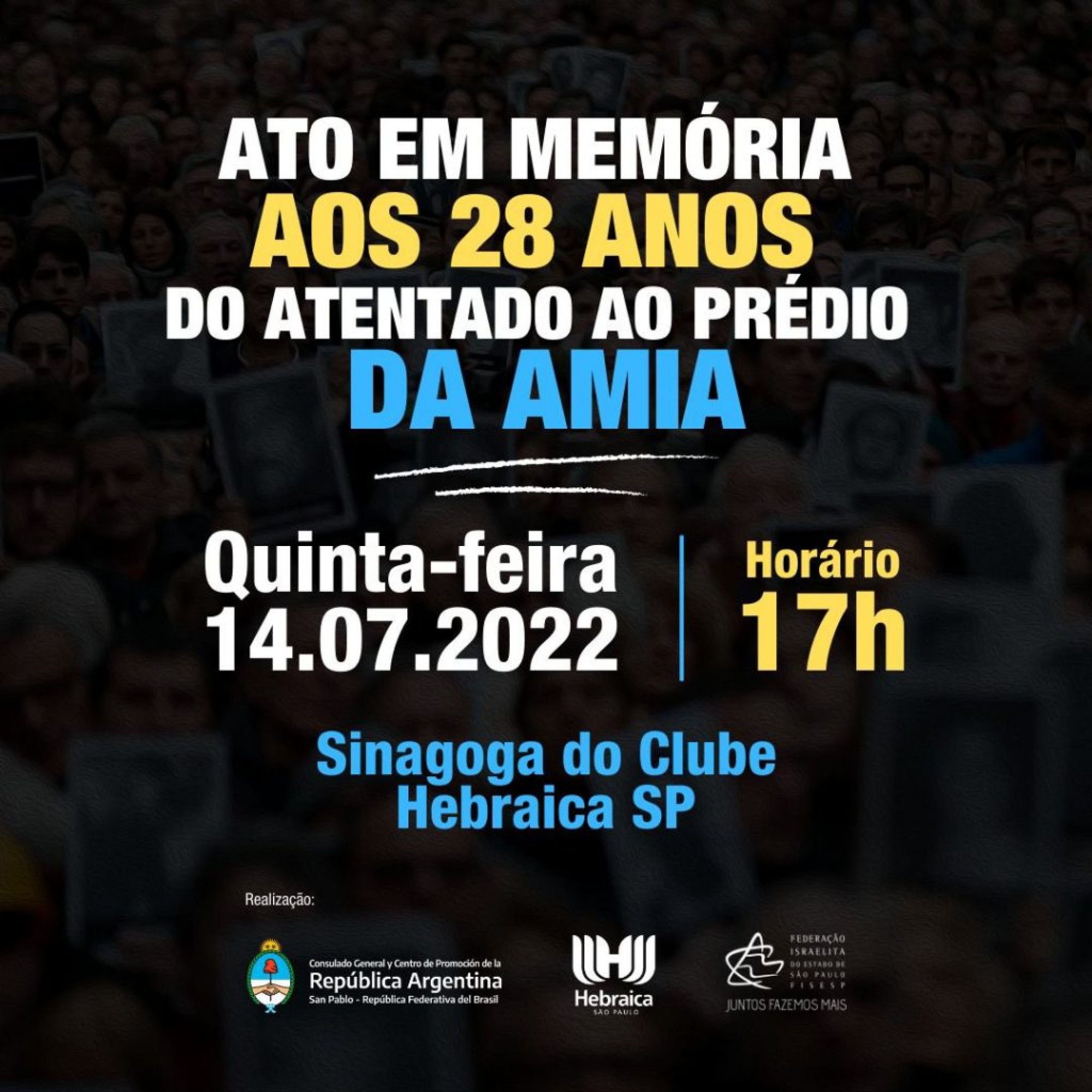 O Consulado Geral e Centro de Promoção da República Argentina, a Federação Israelita do Estado de São Paulo (Fisesp) e o clube A Hebraica realizam nesta quinta -feira (14), às 17h, na Sinagoga de A Hebraica, Ato em Memória pelos 28 anos do atentado à AMIA em Buenos Aires.