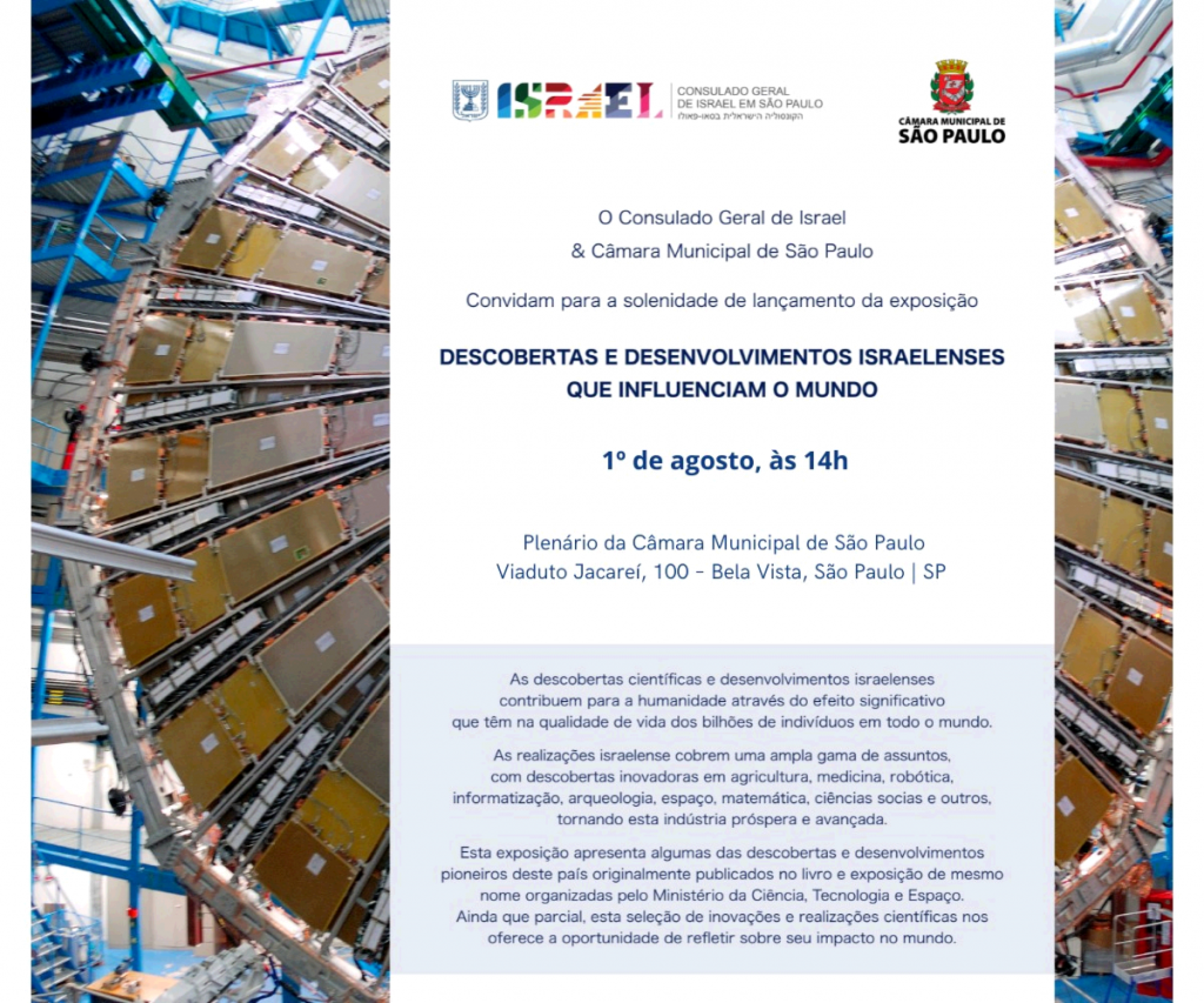 O Consulado Geral de Israel e a Câmara Municipal de São Paulo convidam para a solenidade de abertura, no dia 1/08, às 14h, da exposição “Descobertas e desenvolvimentos israelenses que influenciam o mundo”. A exposição será lançada no Plenário da Câmara Municipal de São Paulo (Viaduto Jacareí, 100 – Bela Vista, São Paulo, SP).