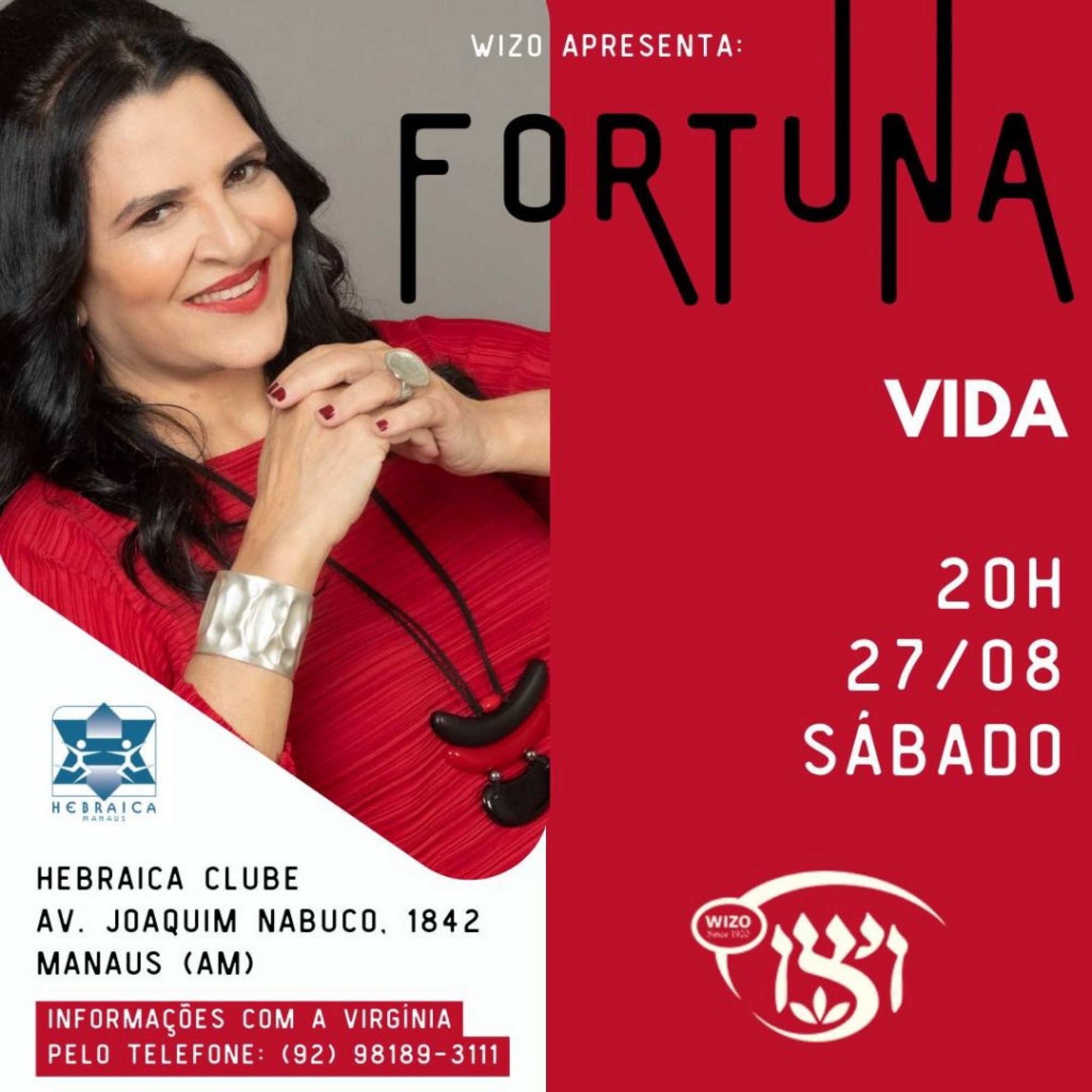A cantora Fortuna vai se apresentar no dia 27 de agosto, às 20h, na Hebraica de Manaus. A apresentação é uma iniciativa da Witzo Manaus e Hebraica Manaus. Mais informações pelo telefone (92) 98189-3111, com Virgínia.