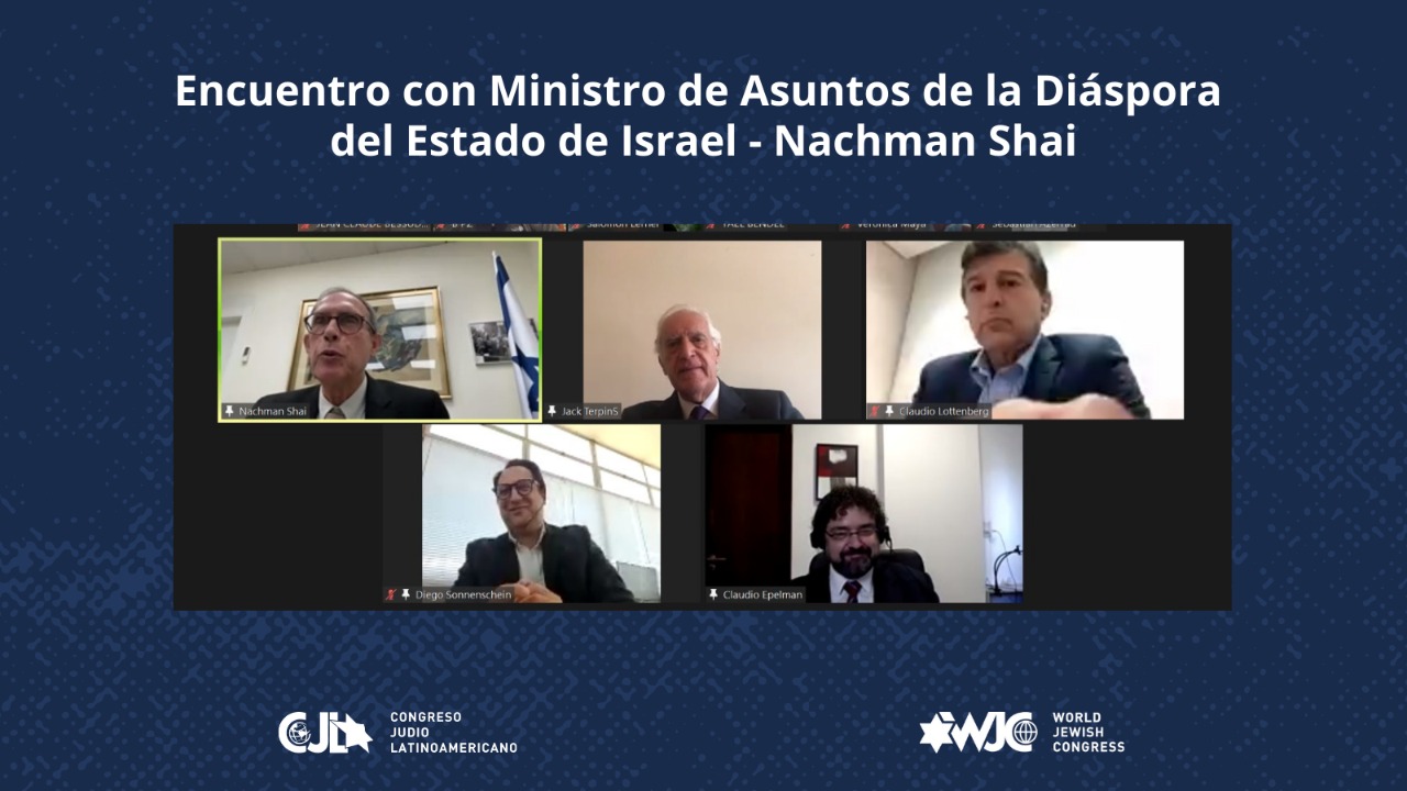O Ministro de Assuntos da Diáspora de Israel, Nachman Shai, se reuniu com representantes do Congresso Judaico Latino-Americano (CJL) e com líderes das comunidades judaicas de toda a região em recente evento online, de acordo com o CJL. Entre os presentes estavam Claudio Lottenberg, presidente da Conib e Conselheiro Especial CJL: Saúl Levine, comissário da organização para as relações com Israel: Jorge Knoblovits, secretário-geral do CJL e Diego Sonnenschein, tesoureiro da organização.. O presidente do CJL, Jack Terpins, abriu o encontro online dando boas-vindas ao ministro e aos líderes das comunidades judaicas de toda a região presentes. Shai falou sobre o novo governo israelense: 'A mensagem é de unidade, de relações mútuas', disse ele. 'Este governo é formado por partidos de esquerda, direita e centro. Compreendemos que era hora de curar as feridas da sociedade israelense. Estávamos divididos, fragmentados e agora estamos entrando em uma nova era', destacou. Em relação à agenda diplomática, o ministro destacou o antissemitismo como um dos temas prioritários do governo nas relações internacionais. Sobre a relação com as comunidades judaicas ao redor do mundo, Shai foi claro: 'Não se trata mais da diáspora ajudando Israel. Não pedimos mais apenas sua ajuda, agora pensamos no que podemos fazer por vocês. Também é nossa responsabilidade compartilhar a vida com a diáspora'.