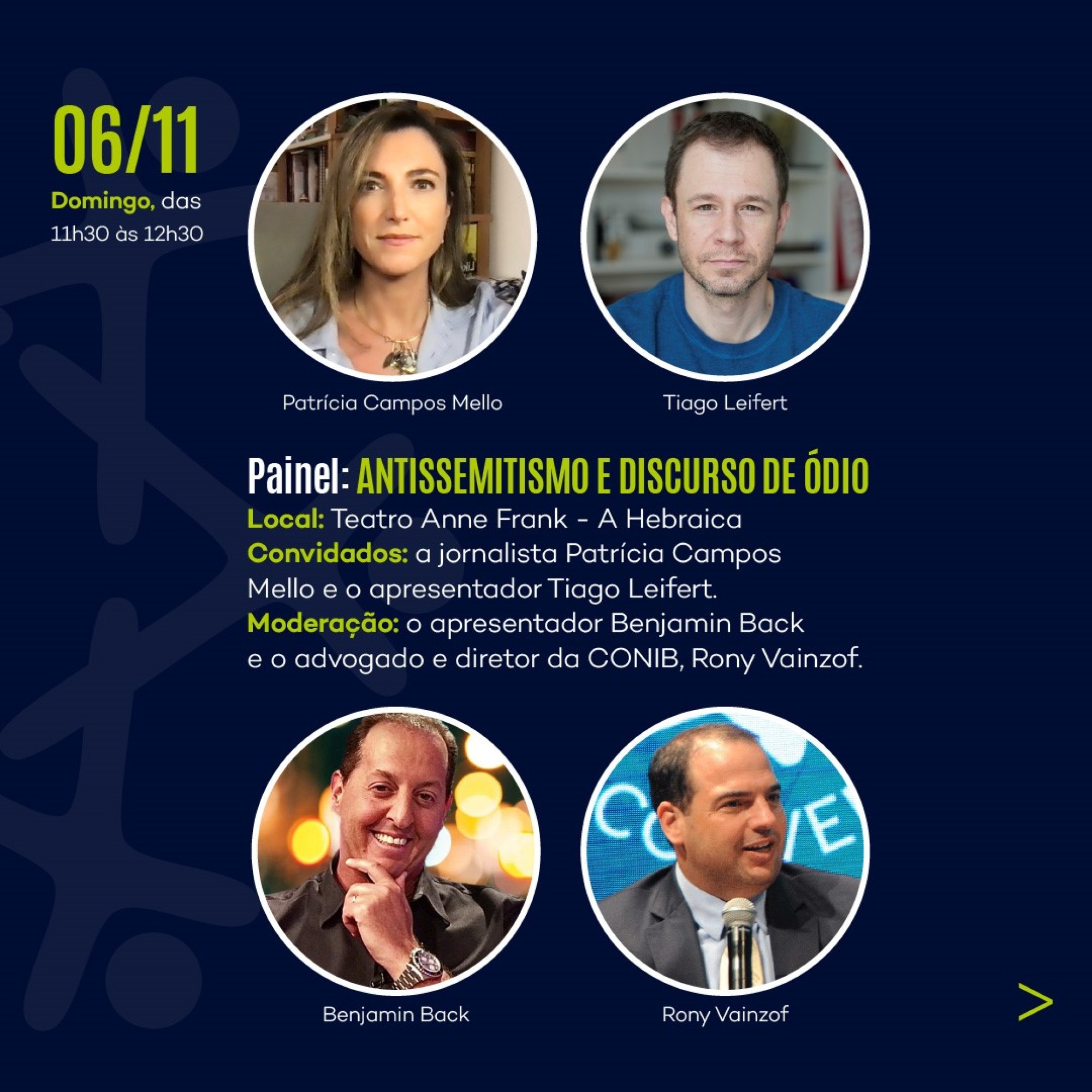 O painel Antissemitismo e Discurso de Ódio (das 11:30h às 12:30h) no domingo (6), no Teatro Anne Frank, no clube A Hebraica de São Paulo, será aberto ao público e abordará depoimentos de pessoas que enfrentaram questões relacionadas ao tema. O painel terá como convidados a jornalista Patrícia Campos Mello e o apresentador Tiago leifert, com a participação do também apresentador Benjamin Back e do advogado e secretario da CONIB, Rony Vainzof. Inscreva-se para participar dos eventos abertos ao público.