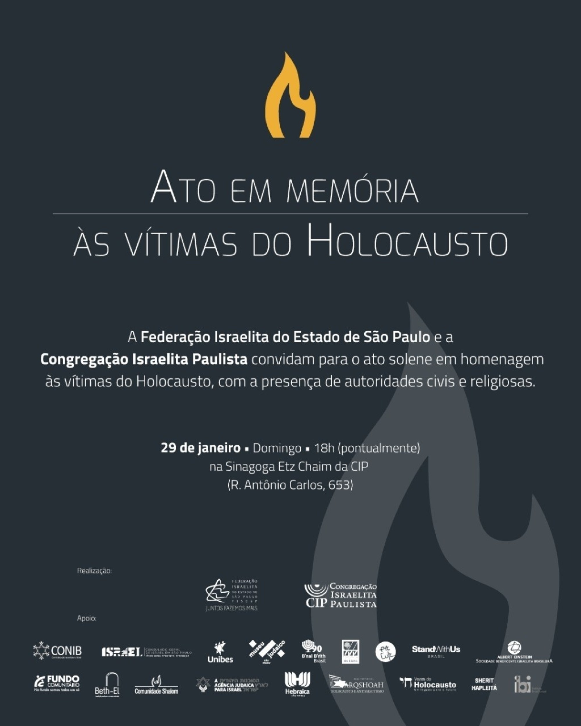 Com o apoio da CONIB, a Federação Israelita do Estado de São Paulo (Fisesp) e a Congregação Israelita Paulista (CIP) realizam no domingo, 29 de janeiro de 2023, às 18h, na Sinagoga Etz Chaim da CIP, Ato em Memória às Vítimas do Holocausto para marcar o Dia Internacional em Memória das Vítimas do Holocausto.