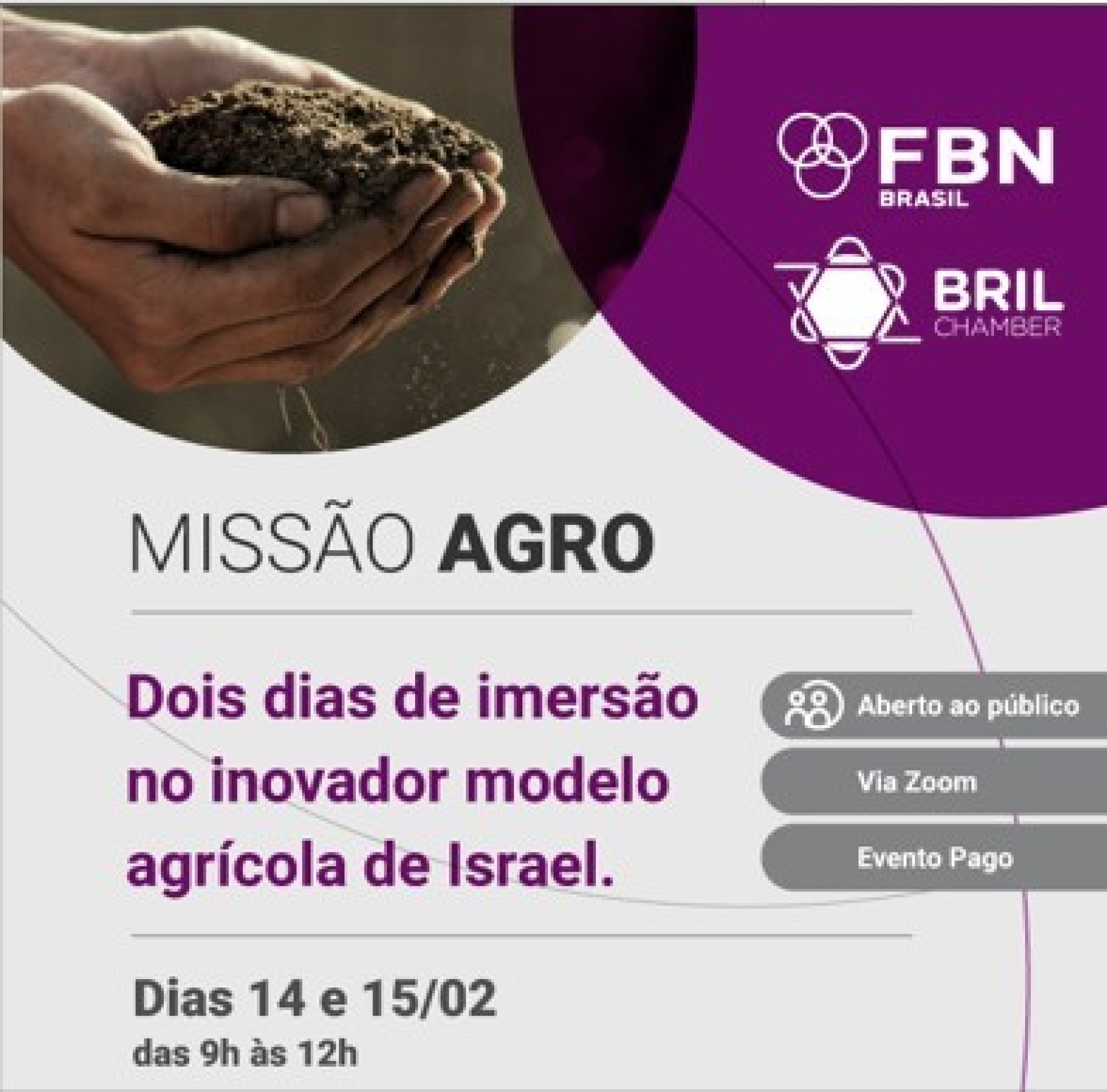 A Câmara Brasil-Israel (BRIL Chamber) e a FBN Brasil, associação que reúne famílias empresárias de mais de 65 países, realizam nos dias 14 e 15 de fevereiro, das 9 às 12h, o evento online “Missão Agro – uma imersão no inovador modelo agrícola de Israel”.