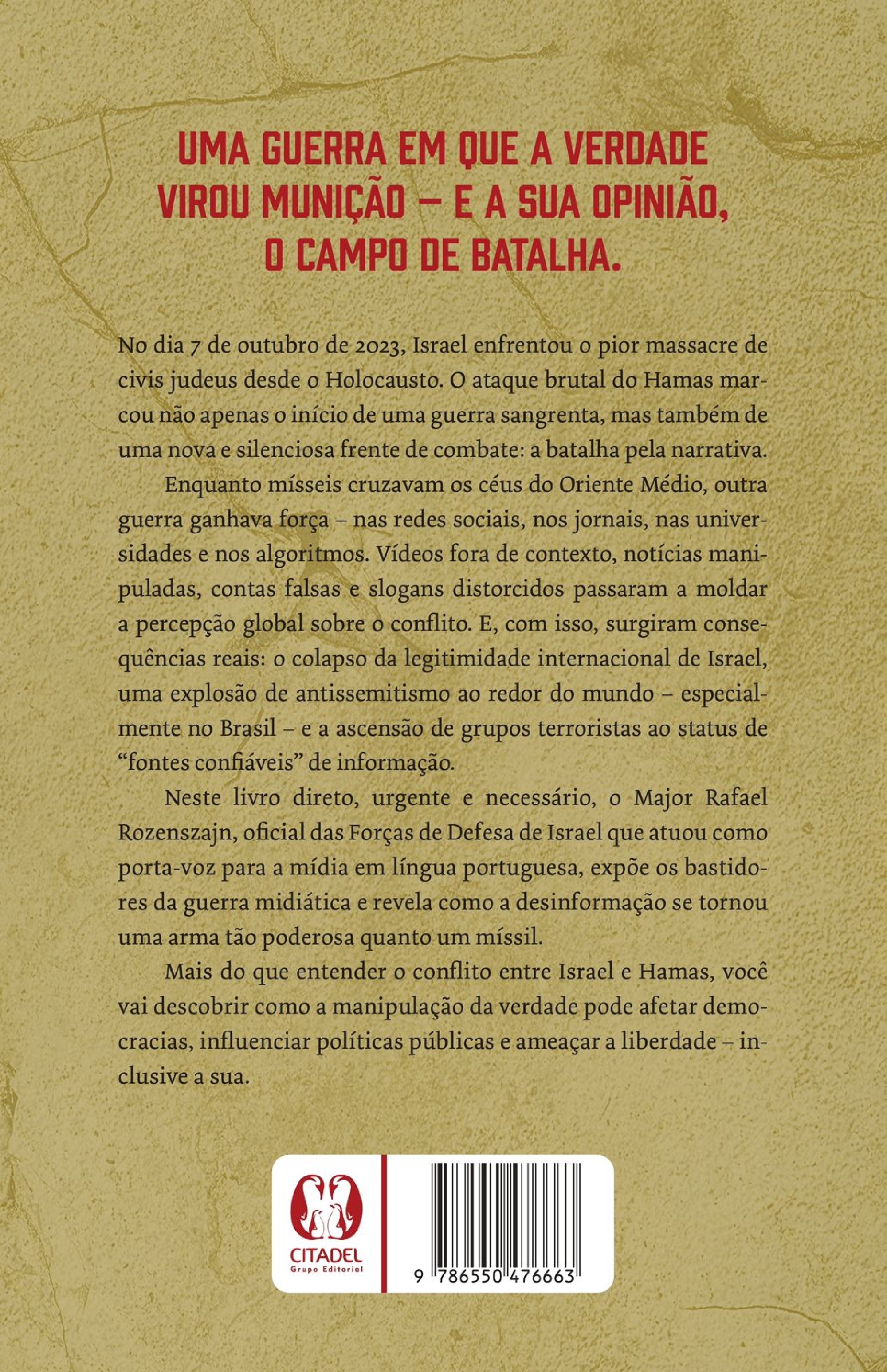 Com base em sua experiência de 18 anos no Exército de Israel, onde atuou em funções militares e jurídicas, Rafael relata os bastidores da guerra informacional, analisando os desafios de enfrentar o terrorismo em meio à pressão internacional e à polarização nas redes sociais. O livro tem prefácio do ministro do STF André Mendonça e posfácio do presidente da Conib, Claudio Lottenberg.