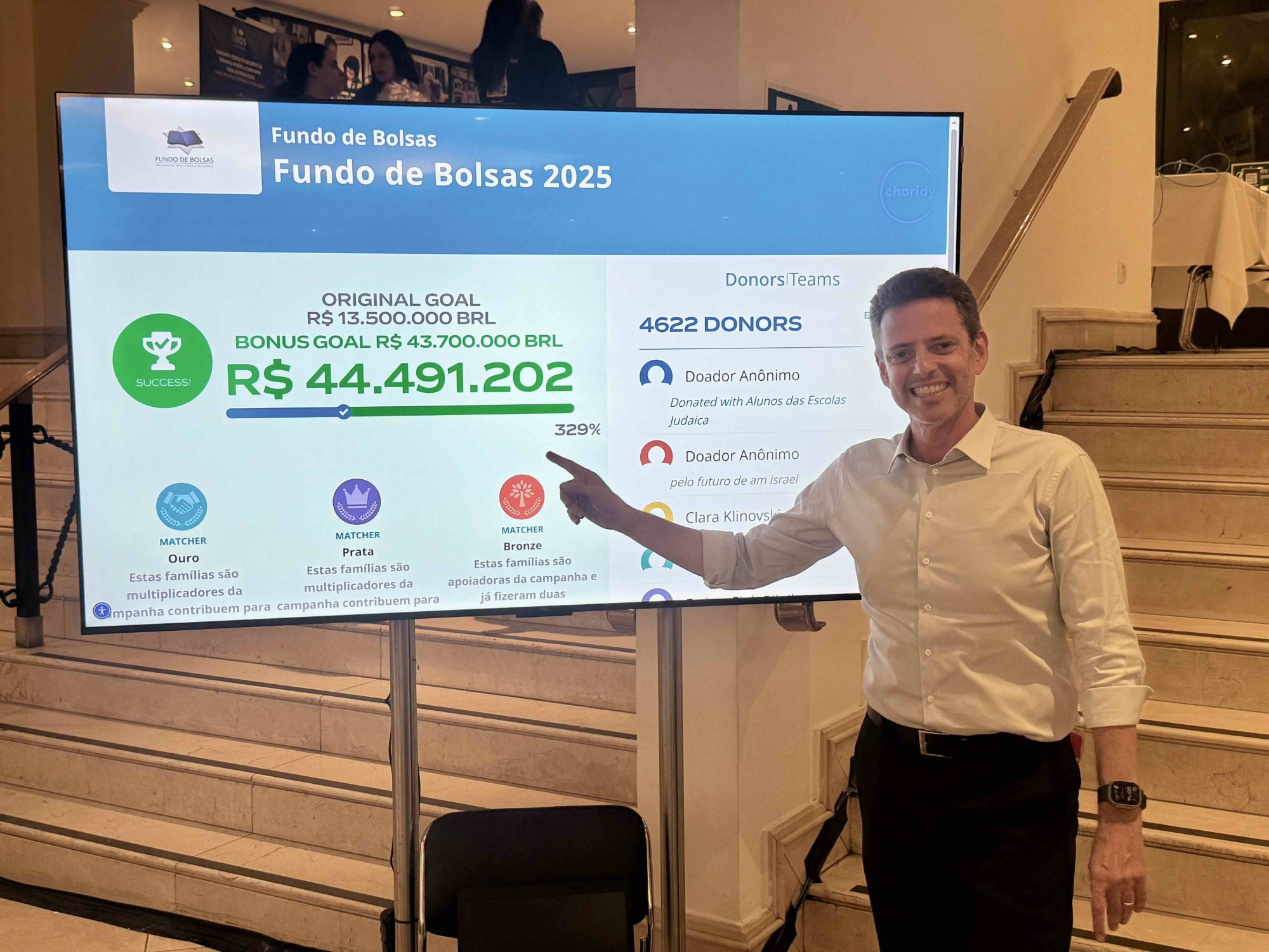 A 10ª edição da Campanha Anual do Fundo de Bolsas, realizada nos dias 6, 7 e 8 de setembro, foi histórica: em apenas 24 horas, a comunidade judaica arrecadou mais de R$ 44,5 milhões, superando a marca alcançada no ano anterior. O resultado foi possível graças ao engajamento de 4.633 doadores, além de 113 matchers e à participação de centenas de voluntários, entre pais, alunos e profissionais das escolas judaicas.