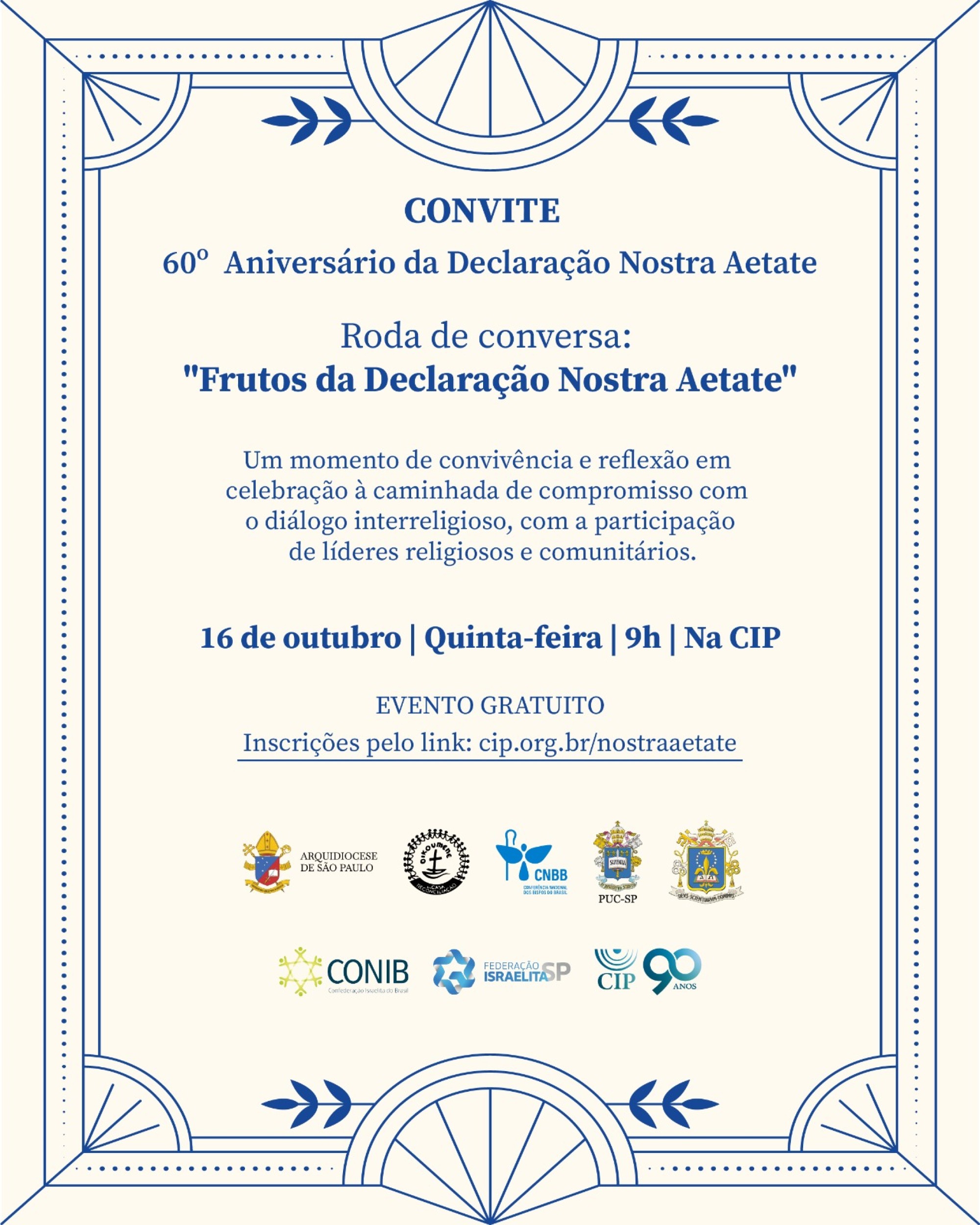 A Congregação Israelita Paulista (CIP), em parceria com a Arquidiocese de São Paulo, CONIB, FISESP, Casa da Reconciliação, CNBB e PUC SP, vai sediar no próximo dia 16 (quinta-feira), às 9h, um dos eventos comemorativos do 60º aniversário da Declaração Nostra Aetate.