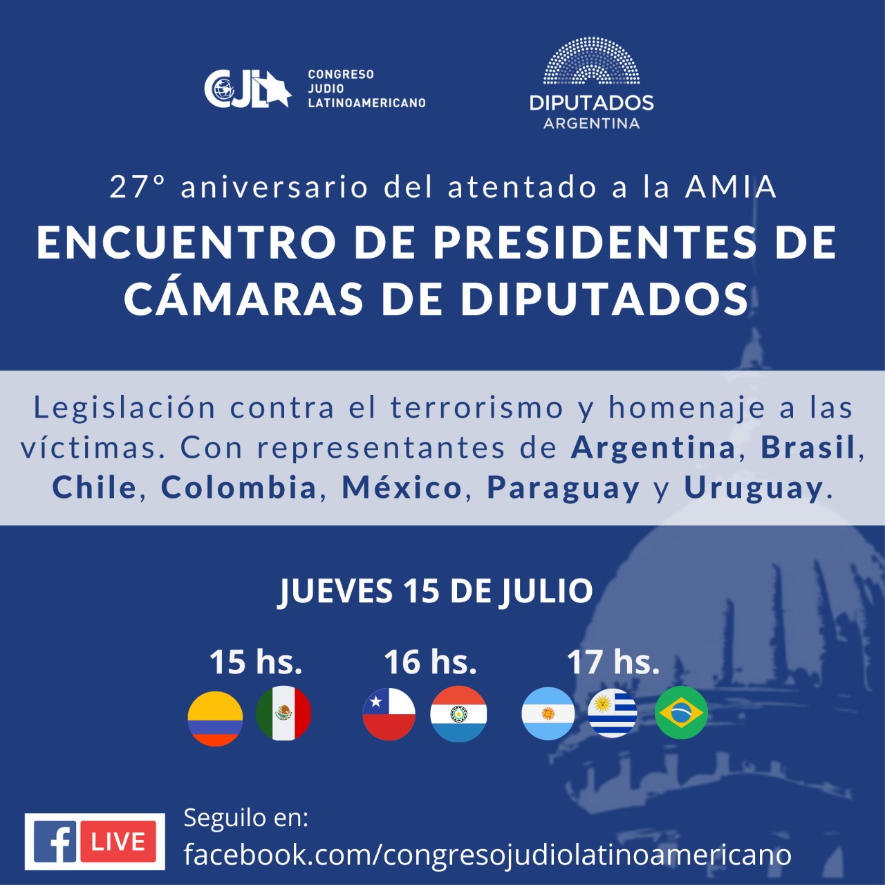 Nesta quinta-feira às 17h, Arthur Lira junto com outros presidentes das Câmaras dos Deputados de países da América Latina participará de cerimônia online, organizada pelo Congresso Judaico Latino-Americano (CJL), para lembrar o 27º aniversário do atentado contra a organização judaica/ AMIA, A abertura do encontro ficará a cargo do presidente do CJL, o brasileiro Jack Terpins. O CJL costuma realizar em cada 18 de julho evento para lembrar o ataque, ocorrido em 1994 em Buenos Aires e que causou a morte de 85 pessoas e ferimentos em mais de 300. Neste 27º aniversário, organizado em conjunto com a Câmara de Deputados da Argentina, uma das iniciativas será um encontro virtual dos presidentes das Câmaras de Deputados de 6 países da região (Brasil, Uruguai, Chile, Paraguai e México), em homenagem às vítimas e aos sobreviventes. Para acompanhar o endereço é: |