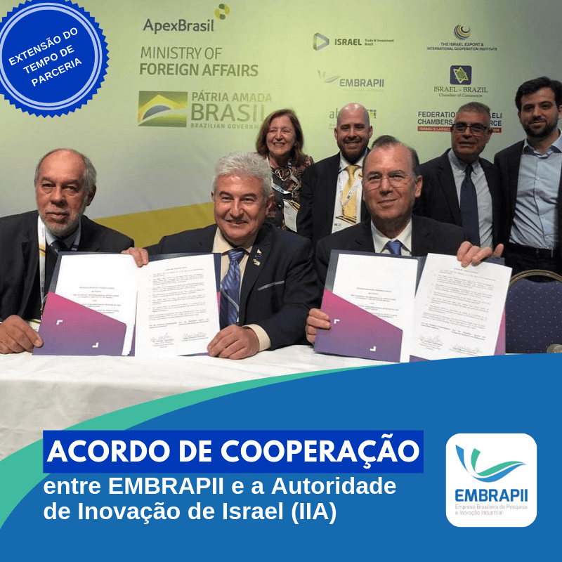O diretor-presidente da Empresa Brasileira de Pesquisa e Inovação Industrial (EMBRAPII), Jorge Guimarães, e o cientista chefe do Ministério da Economia e Industria de Israel, Amiram Appelbaum, assinaram esta semana em Israel, a extensão do tempo de parceria do acordo de cooperação entre a Embrapii e a Autoridade de Inovação de Israel (IIA) até junho de 2019. O Ministro da Ciência, Tecnologia, Inovações e Comunicações (MCTIC), Marcos Pontes, também esteve presente na cerimônia. A Embrapii levou empresas brasileiras a Israel para buscar parcerias em projetos de inovação. A Embrapii e a Autoridade de Inovação de Israel vão destinar US$ 10 milhões de dólares (US$ 5 milhões por parte de cada um dos países) a projetos inovadores realizados em conjunto por empresas com sede no Brasil ou em Israel. O edital de convocação foi lançado em novembro de 2018 e é voltado para projetos de desenvolvimento de novas tecnologias nas áreas de energia, IoT (Internet das Coisas), agricultura e ciências da vida. A proposta deve envolver ao menos uma empresa de cada país e resultar no desenvolvimento de um novo produto, novo processo produtivo ou serviço de aplicação industrial. Conforme informações da Embrapii, o projeto também deve ter potencial de mercado e agregar valor às economias de ambos países. Nesse modelo de cooperação internacional, cada país financia suas respectivas empresas. As empresas brasileiras devem estar associadas à rede credenciada de 42 Unidades Embrapii para o desenvolvimento do projeto. Por conta da viagem de Jair Bolsonaro a Israel, foram assinados acordos bilaterais nas áreas de ciência e tecnologia, defesa, segurança pública, aviação civil, segurança cibernética e saúde