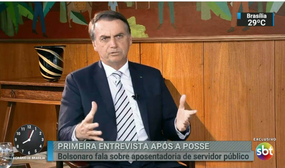 Em sua primeira entrevista após a posse, o presidente Jair Bolsonaro voltou a falar sobre os planos de transferir a embaixada brasileira em Israel de Tel-Aviv para Jerusalém, decisão que causou a reação de países árabes. O presidente reconheceu que alguns países “mais radicais podem tomar alguma sanção econômica”, mas disse que a situação é um reconhecimento da autonomia israelense em determinar onde deve ser sua capital. 'Não vou deixar de reconhecer a autoridade de Israel. Quem vai decidir onde vai ser a capital de Israel é seu governo e seu povo, e ponto final. Imagine se não tivéssemos ligações comerciais e diplomáticas com Israel, onde eu botaria a embaixada de Israel? Em Tel-Aviv ou Jerusalém? Botaria em Jerusalém. E qual diferença se por ventura nós resolvemos transferir a embaixada de Tel Aviv para Jerusalém? No meu entender problema nenhum”, disse. Na entrevista, Bolsonaro admitiu estar aberto a discutir a possibilidade de instalação de uma base militar americana no Brasil. “A questão física pode ser até simbólica”, disse. “E o poderio das Forças Armadas americanas, chinesas e soviéticas alcança o mundo todo independente de base, agora, de acordo com o que puder vir a acontecer no mundo, quem sabe você tenha que discutir essa questão no futuro”, afirmou Bolsonaro em entrevista para o SBT. Bolsonaro também afirmou que deve visitar o presidente americano, Donald Trump, em março. “A princípio isso aí está pré-acertado”, disse o presidente brasileiro, ao citar encontro que teve com o secretário de Estado dos Estados Unidos, Mike Pompeo, na véspera. “Eu reconheço a minha posição, nós sabemos que o presidente Donald Trump é o homem mais poderoso do mundo, eu gostaria muito que nos visitasse”, afirmou.