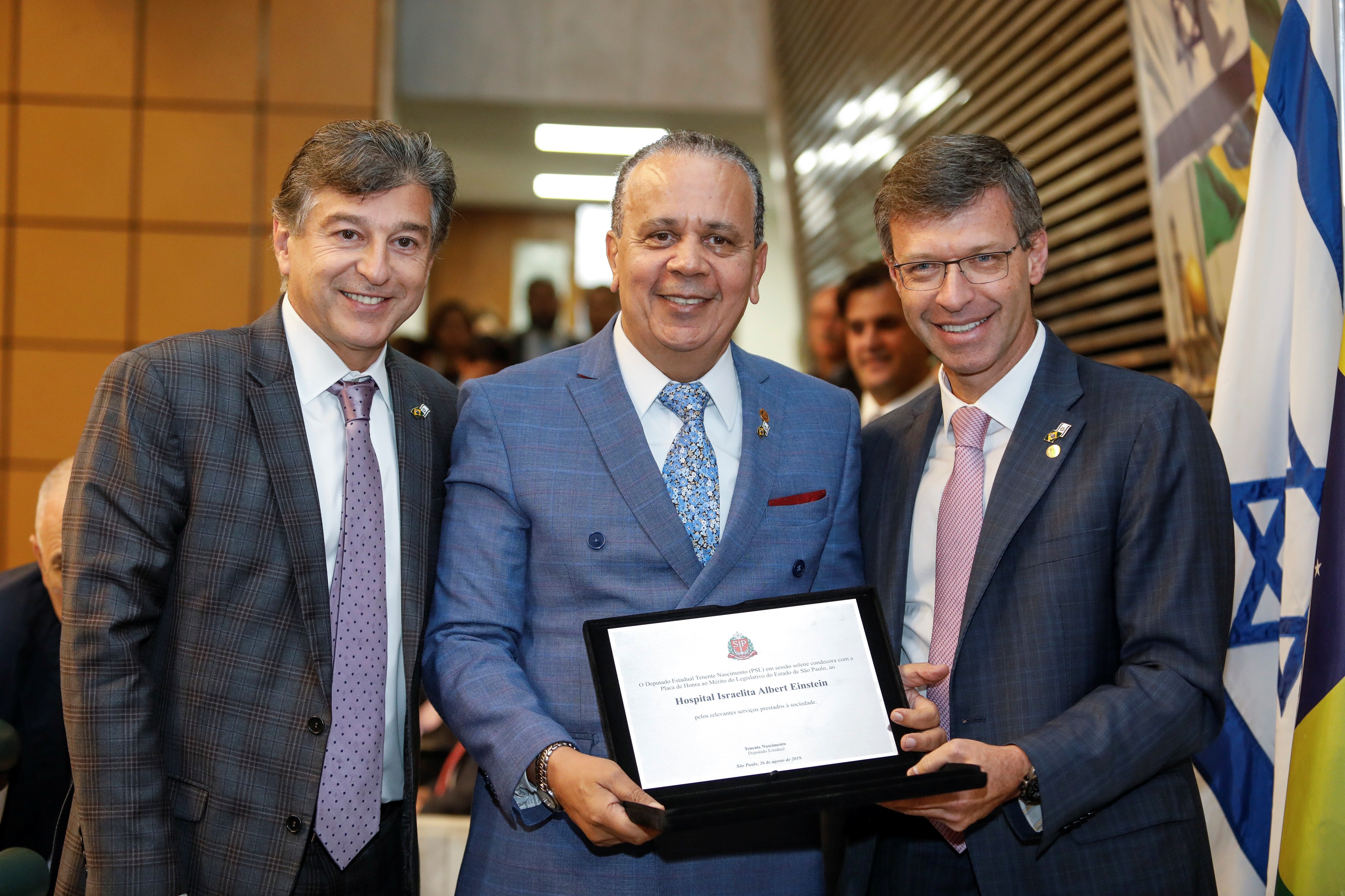 A trajetória de excelência do Hospital Israelita Albert Einstein foi reconhecida em homenagem promovida pelo deputado estadual Tenente Nascimento, realizada na Assembleia Legislativa do Estado de São Paulo, na manhã de 26 de agosto. Dr. Sidney Klajner, presidente da Sociedade Beneficente Israelita Brasileira Albert Einstein, e Dr. Claudio Lottenberg, presidente do Conselho Deliberativo da instituição, receberam a honraria como representantes da destacada atuação do Einstein em direção ao avanço do sistema de saúde brasileiro, informou o Einstein. “É uma honra e um privilégio receber este reconhecimento. Qualidade e segurança na assistência estão na essência do Einstein. E é isso que nos permite ter indicadores de desempenho e resultados em patamares semelhantes aos das melhores instituições de saúde do mundo. Outro elemento que está na nossa essência é o acolhimento”, ressalta Klajner. Durante a sessão solene, o parlamentar destacou o relevante papel da organização por meio da atuação na área de pesquisa e inovação, prestação de assistência médica e gestão de equipamentos do Sistema Único de Saúde na capital paulista. Na ocasião, o deputado também concedeu o Colar de Honra ao Mérito Legislativo do Estadão de São Paulo ao embaixador de Israel no Brasil, Yossi Shelley, como forma de exaltar o trabalho desempenhado para estreitar as relações entre Brasil e Israel. Foto: Fabio H. Mendes/ Divulgação Einstein  :